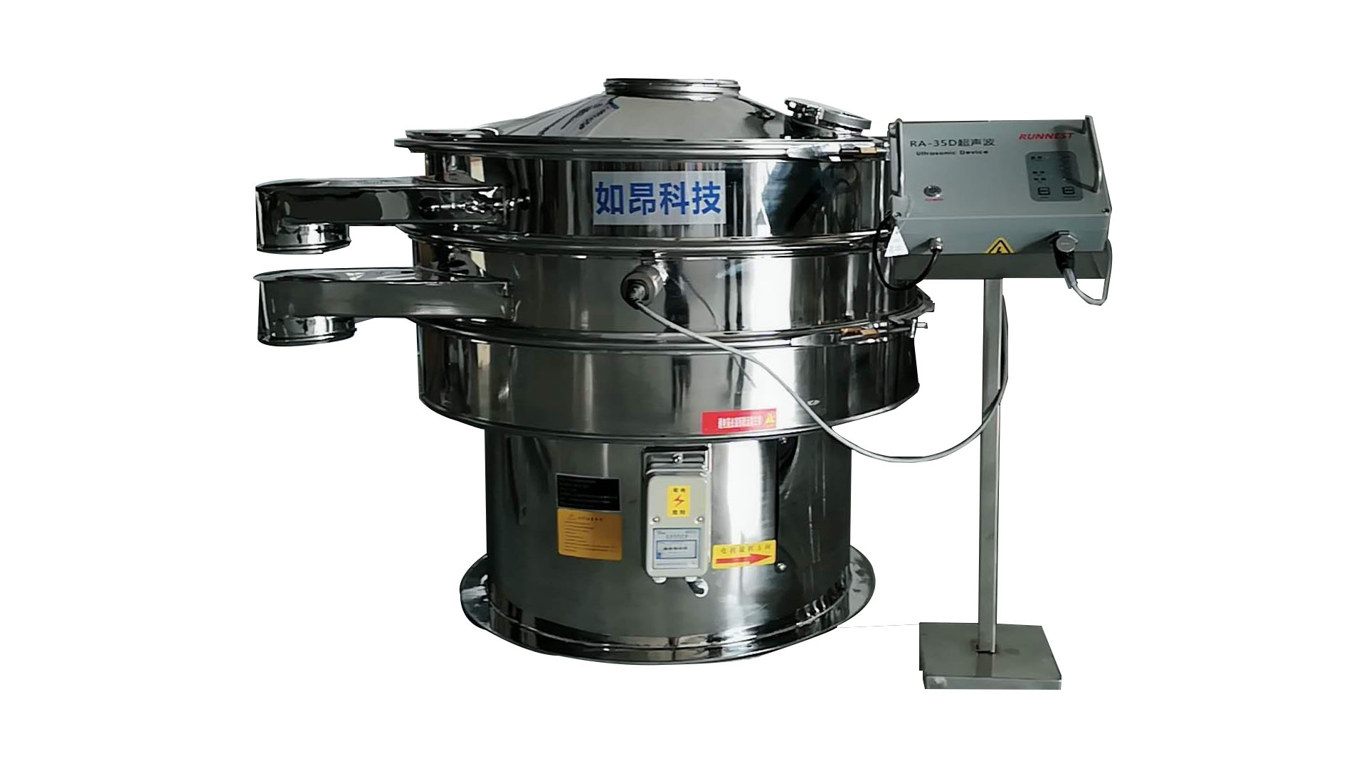超聲波振動篩由超聲波諧振電源、振蕩器、共振環組成。超聲波諧振電源產生的高頻電振蕩由振蕩器轉換成高頻三次元振蕩波,這些振蕩波傳到共振環上使共振環產生共振,然后由共振環將振動均勻傳輸至篩面。篩網上的物料在做低頻三次元振動的同時,疊加上超聲波振動,既可防止網孔堵塞,又可提高篩分產量和質量。